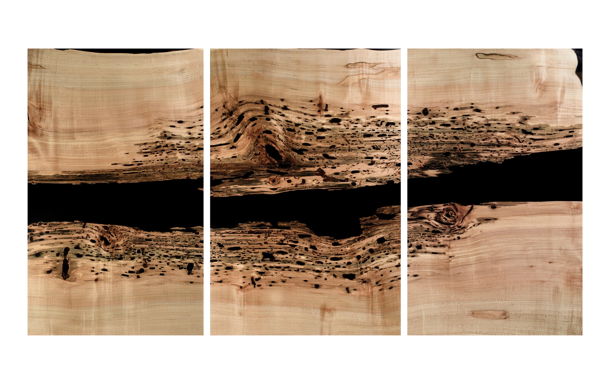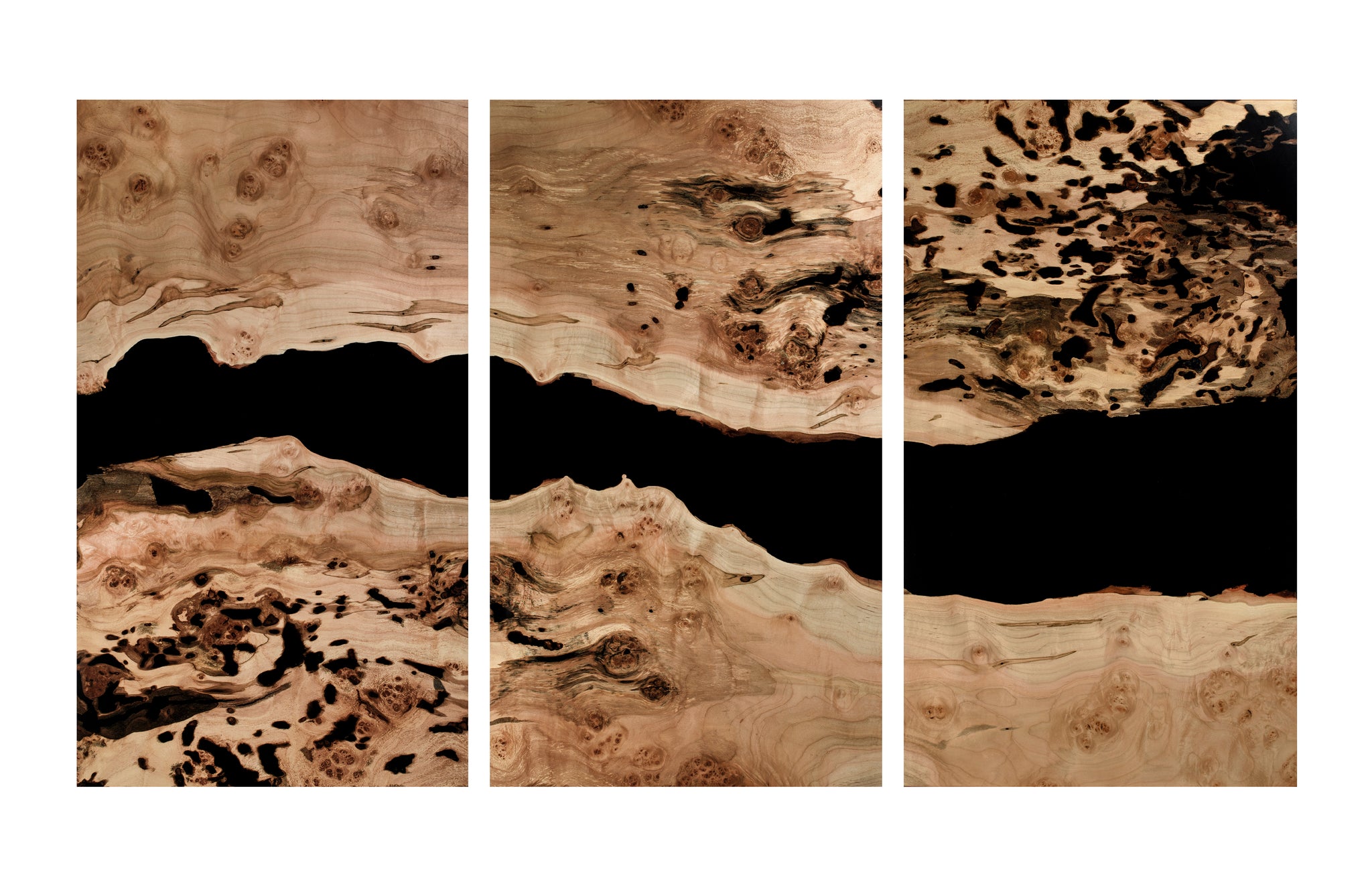 This triptych (meaning 3-piece series) is crafted from an incredibly unique slab of European Elm Cluster. This slab has a "live edge" on almost every side, making the resulting series more sculptural than typical slabs that are cut and manufactured into sheets of lumber with only one natural "live" edge. Up close, you can see the texture of the live edges disappearing into the depth of the onyx background.